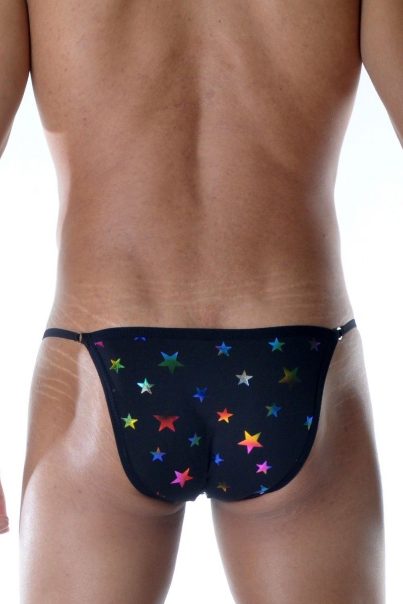 Черные мужские трусы-танга с разноцветными звездами.