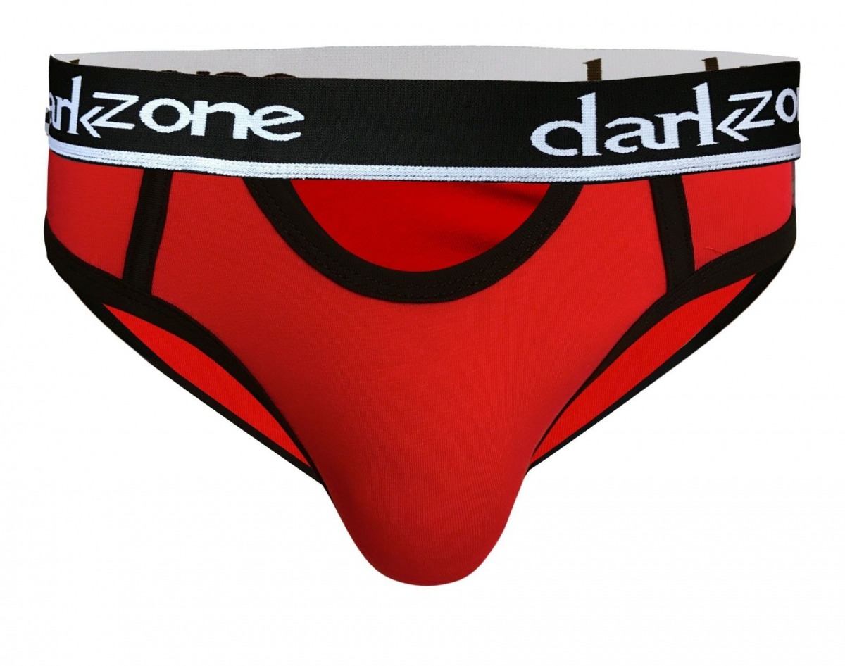 Красные мужские трусы-брифы с вырезом.