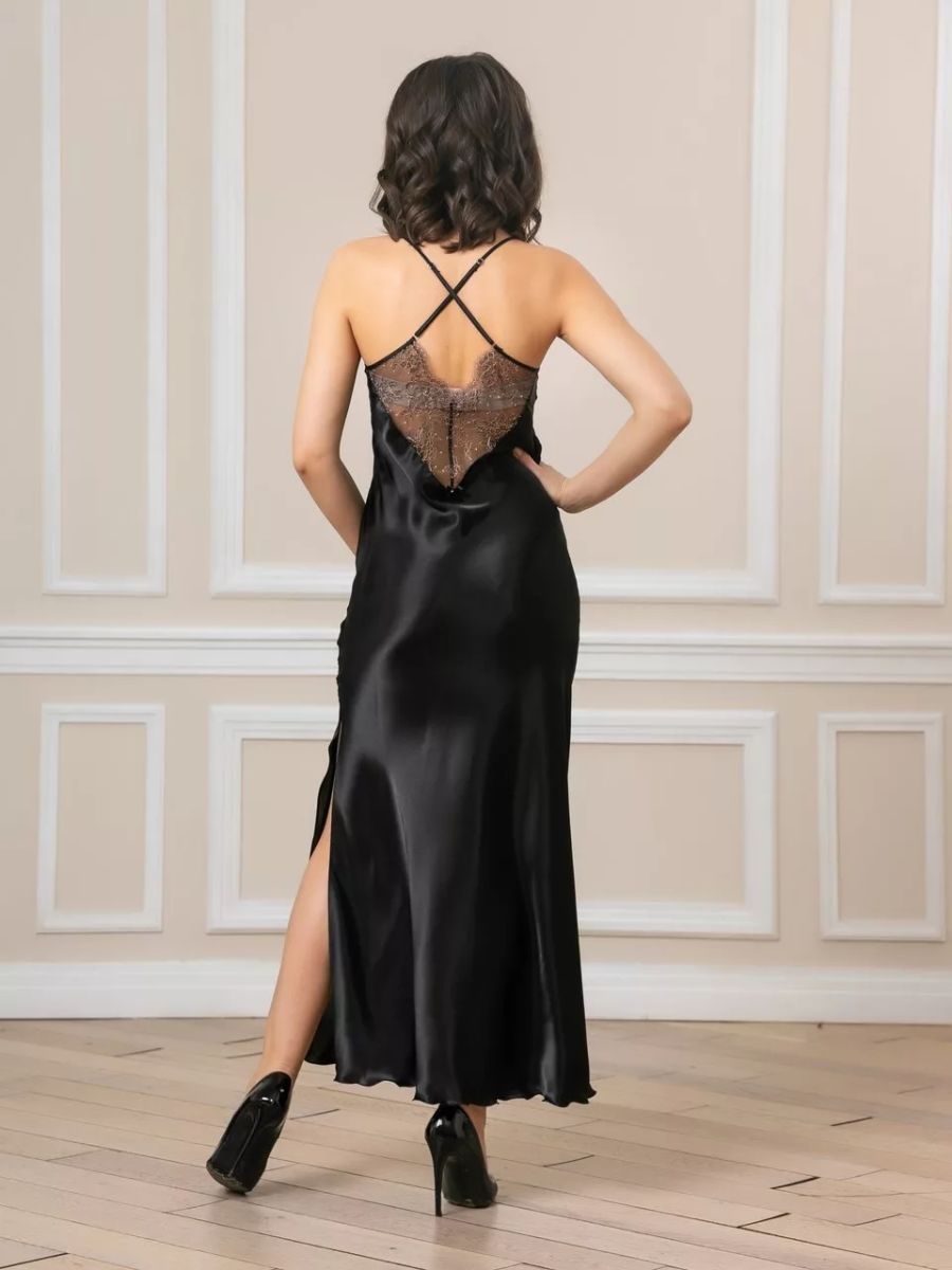 Длинная сорочка на узких бретелях из искусственного шелка, декорирована кружевом по линии декольте и разрезом до колена.