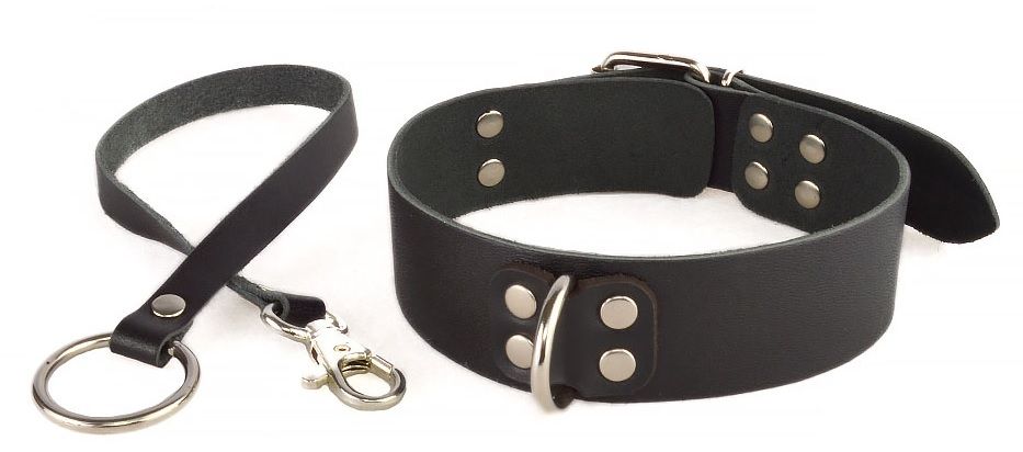 Ошейник изготовлен из натуральной кожи. Поводок в виде кожаной ленты с карабином с одной стороны и колечком с другой. Регулируется при помощи пряжки.