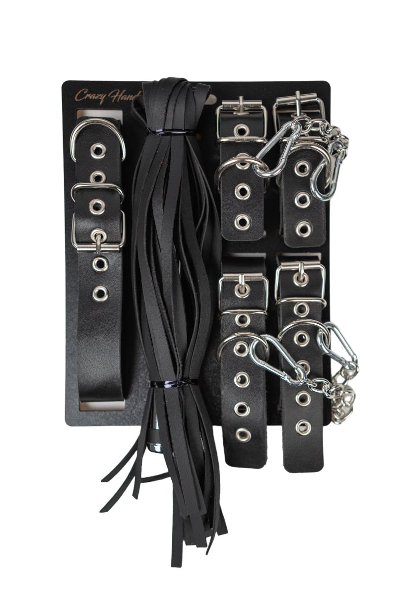 В набор входит плеть, ошейник, наручники и оковы. Плеть состоит из стальной хромированной рукояти и хлыстов из искусственной кожи премиум качества. Количество хлыстов: 23 шт. Ручка-петля на конце изделия служит для дополнительной фиксации флоггера на запястье и предотвращает его выскальзывание из руки во время любовных игр. Баланс веса ручки и веса ударной части соблюден. Ошейник однослойный из натуральной кожи в классическом дизайне. Изделие дополнено фурнитурой высокого качества, в том числе прочным хромированным полукольцом. Наручники однослойные классического дизайна выполнены из натуральной кожи. На каждом наручнике прочное хромированное полукольцо. В комплекте соединительная цепочка с двумя карабинами. Оковы однослойные классического дизайна выполнены из натуральной кожи и дополнены фурнитурой высокого качества, в том числе прочными хромированными полукольцами. В комплекте соединительная цепочка с двумя карабинами. Общая длина плети - 50 см. Длина ручки плети - 20 см. Длина ошейника - 42,5 см. Ширина ошейника - 2,5 см. Обхват ошейника - 32-41 см. Длина наручников - 23 см. Ширина наручников - 2,5 см. Обхват наручников - 15-22 см. Длина оков - 31 см. Ширина оков - 2,5 см. Обхват оков - 20-29 см.